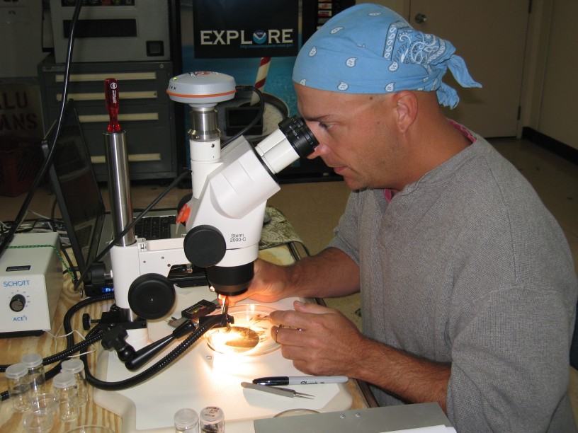 Tracey identifying deepsea fish. NJ Copley, WHOI